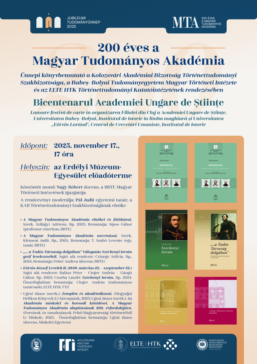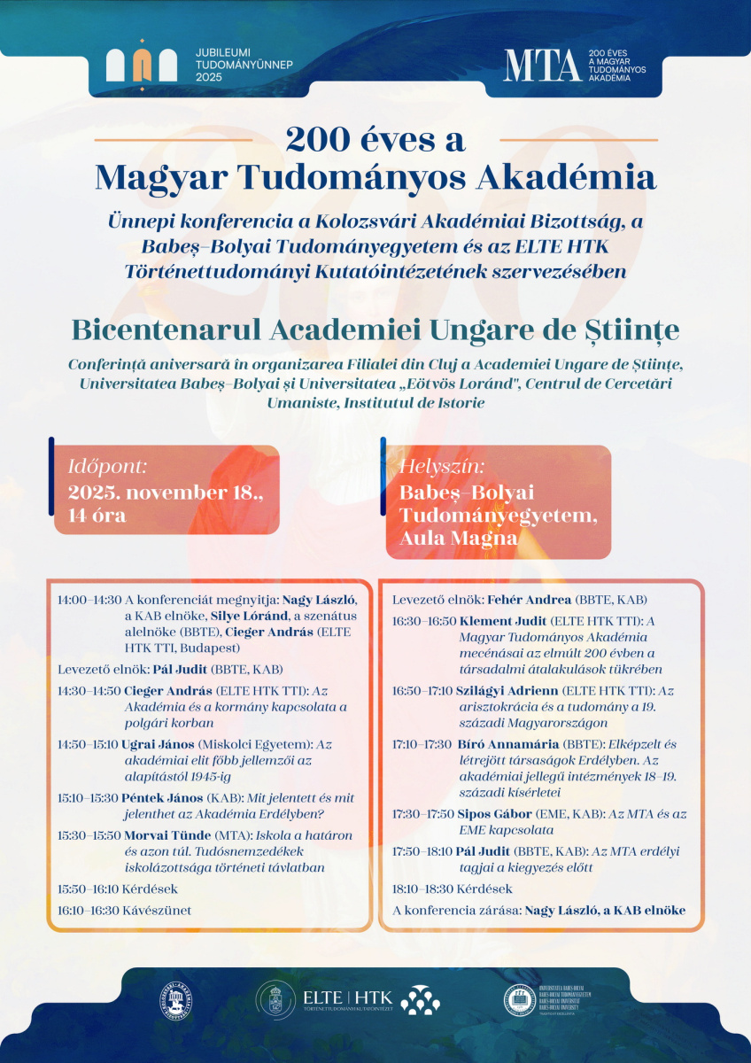 A szervező intézmények nevében szeretettel meghívunk minden érdeklődőt november 17-én és 18-án, a Magyar Tudományos Akadémia fennállásának 200. évfordulójára szervezett ünnepi könyvbemutatóra és konferenciára november 17-én és 18-án!